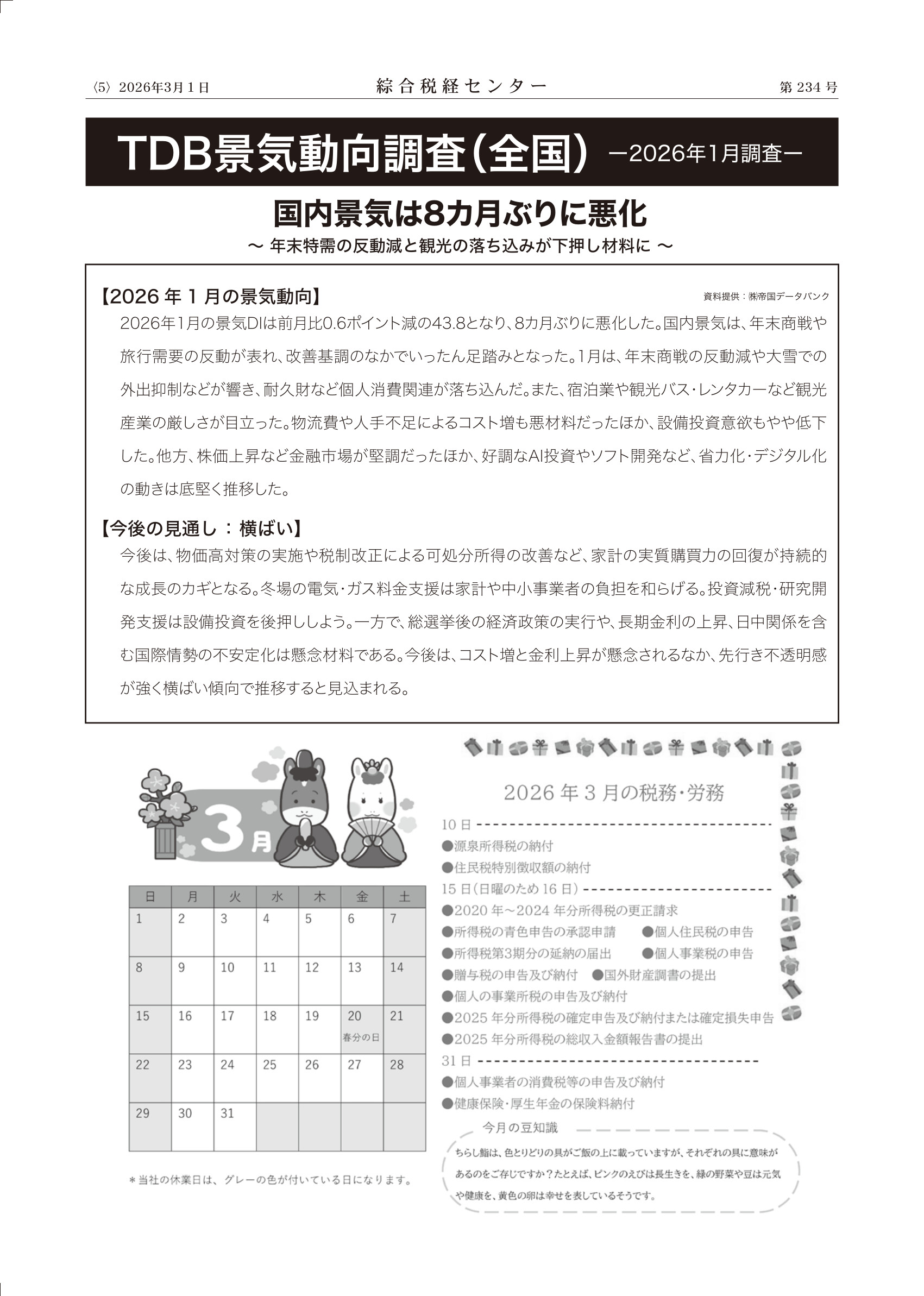 2月8日に投開票された衆議院議員選挙で自由民主党が大勝し、単独で316議席を獲得した。これは、憲法改正の発議が可能な3分の2を超える議席であり、高市政権が極めて強力な基盤を得たことになる。一方野党側は、急遽合流した政党や新党など対立候補者が乱立したため、かえって小選挙区では自民党候補の得票率が目立つ形となった。最近では、与党の議席が過半数を割っていたため少数野党でもキャスティングボードを握り政策に影響力を与える機会もあったのだが、3分の2の議席ではそのような影響力はなくなってしまうであろう。株式市場はすぐに反応し、日経平均株価が上昇し瞬間的ではあるが5万8千円台にも達した。日本経済が強くなる方向を目指さなければならないのも事実だが、もし可処分所得のアップが伴わないインフレが進むとすれば、国民は恩恵を受けるどころか生活に困窮することとなり新政権に失望してしまうはずだ。やはり国民生活の豊かさを求める政治がなければ、本当の国民の信を得られないのだから。